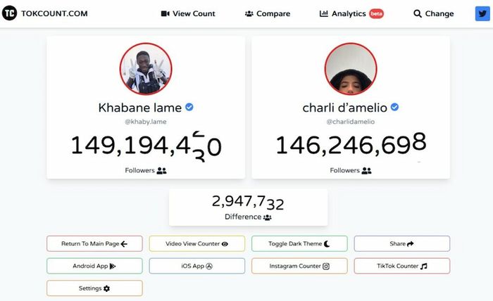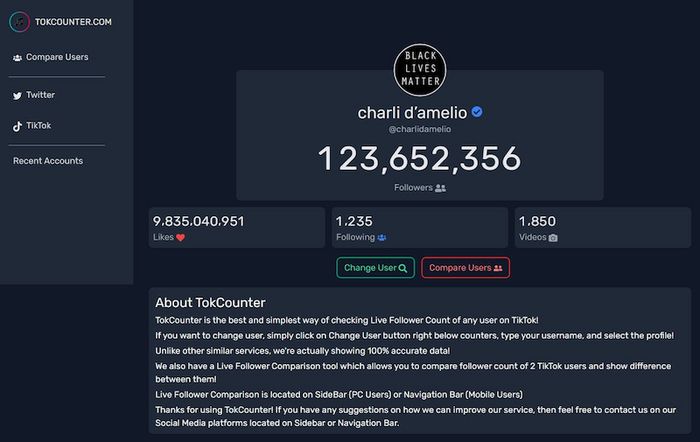 Ngoài ra, TikTok Counter còn cung cấp tính năng so sánh hai người dùng trên TikTok theo thời gian thực. Công cụ này dựa vào các thông số và phân tích trên ứng dụng như số người theo dõi và lượt tương tác để đưa ra kết quả so sánh chi tiết và chính xác.