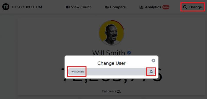 Bước 2: Trên trang web, bạn nhấn vào Change, sau đó nhập tên người dùng vào ô tìm kiếm và nhấn Search. Ngay lập tức, hệ thống sẽ hiển thị danh sách các tài khoản TikTok liên quan, bạn chỉ cần tìm và chọn tài khoản mà mình muốn xem. Khi đó, thông tin dữ liệu của kênh TikTok sẽ xuất hiện trên màn hình.
